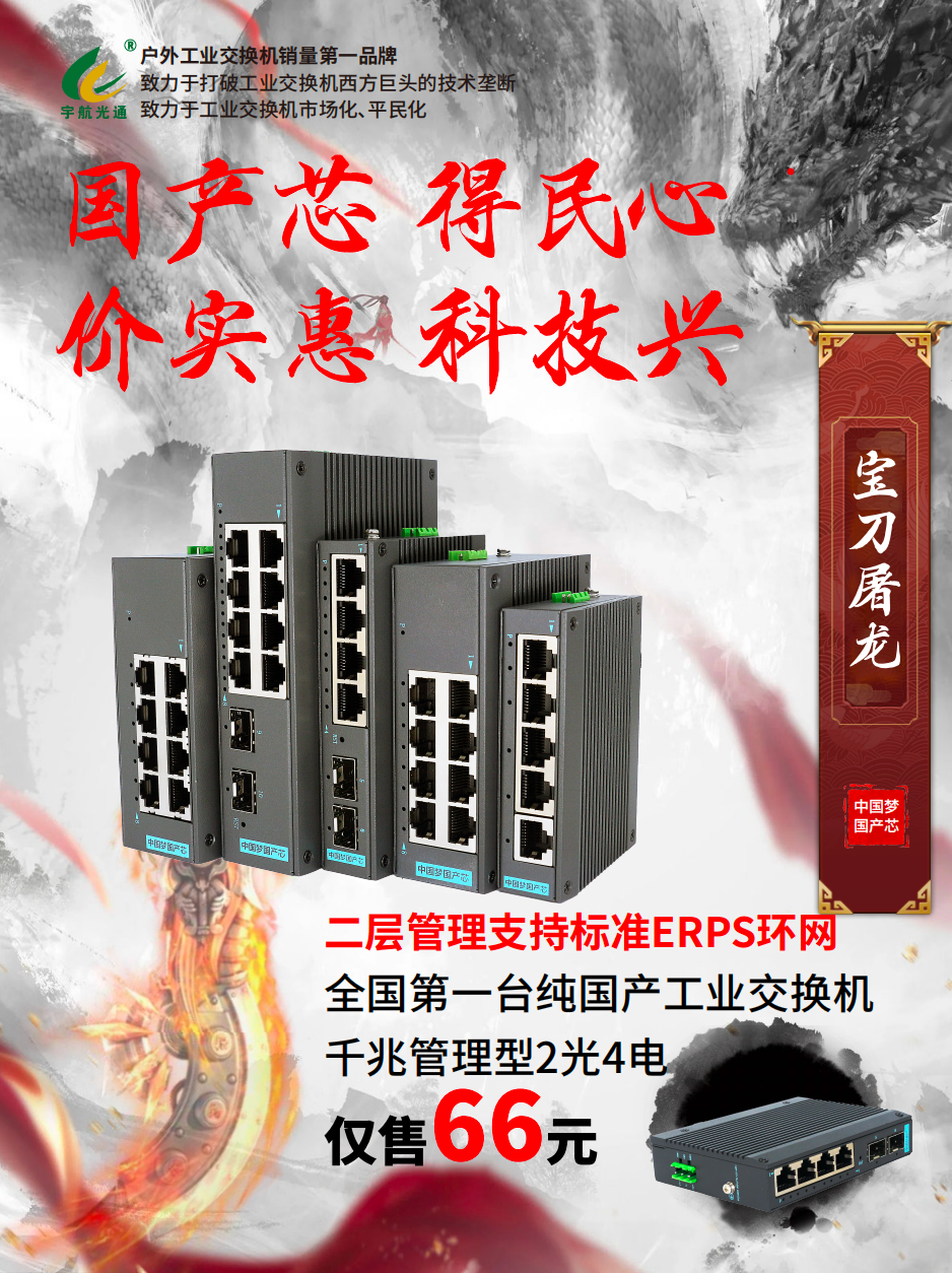 宇航工業交換機全國產管理型千兆2光4電工業級交換機是全球第一臺100%全國產工業級管理型交換機,其重要意義不言而喻。宇航率先邁出全國產的第一步,這是充滿勇氣和智慧的一步。宇航工業交換機張總表示:“作為一個企業要有自己的使命和擔當,助力祖國繁榮富強就是宇航的使命和擔當。為了以后我們不再受美國對我們芯片的打壓,這一步宇航必須要走,我們不怕別人打壓我們,就算被打壓也要堅持做下去。”