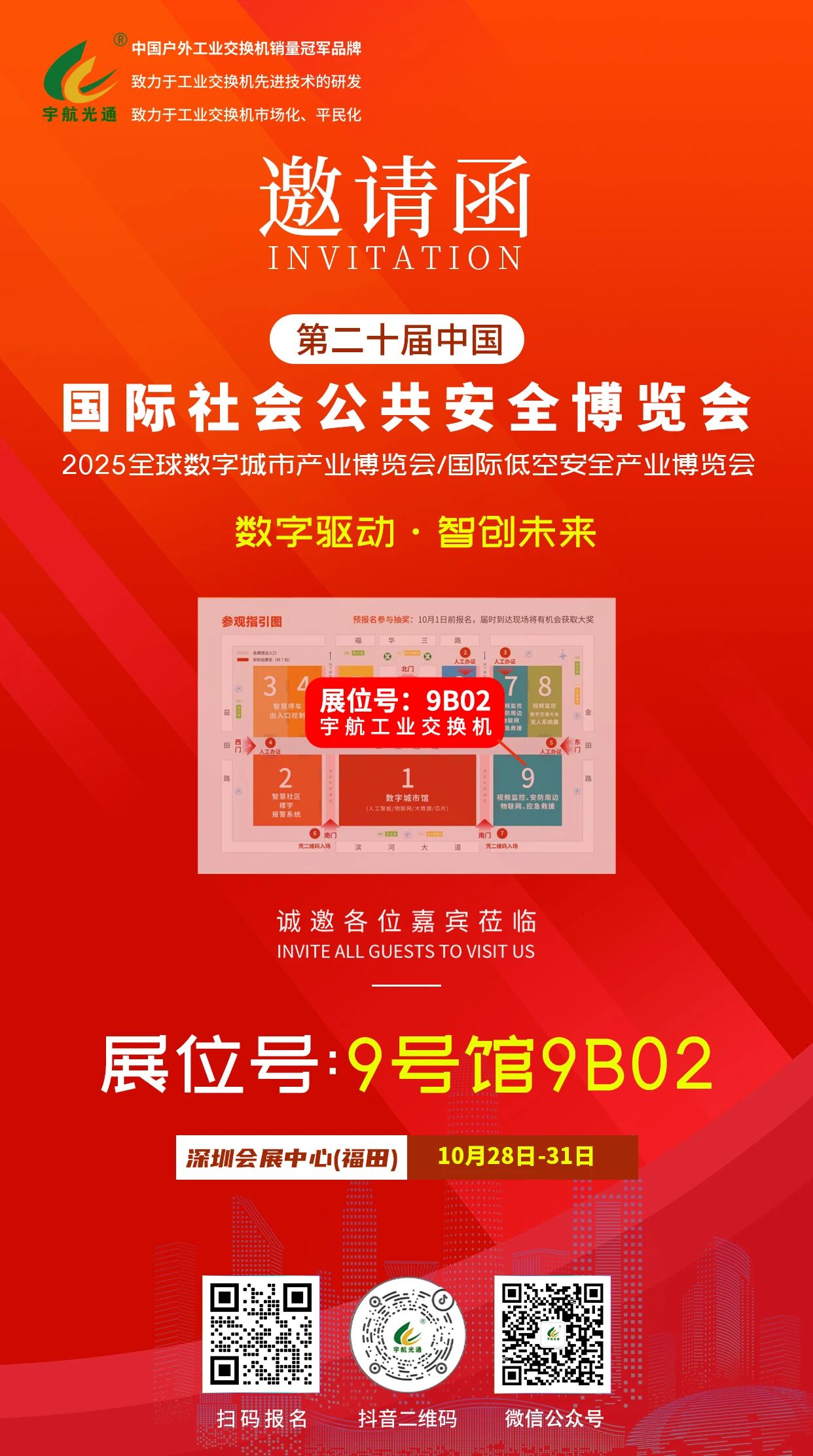 金秋十月,盛會將至。第二十屆中國國際社會公共安全博覽會(以下簡稱:深圳安博會)即將于10月28日-31日在深圳隆重開幕。作為全國產工業交換機行業發展的深度參與者與推動者,宇航工業交換機已準備就緒,為您呈現和發布全國產工業交換機最新研究成果與前沿解決方案。展位號【9B02】,我們期待與您相約深圳,共話未來!
