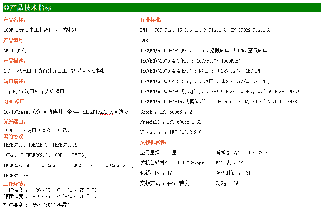 1路百兆電口+1路百兆SFP光口工業級以太網交換機,支持1個10Base-T/100Base-TX電口和1個100Base-X光口。產品符合FCC、CE、ROHS標準。AF11F系列交換機具有-30℃~75℃的工作溫度,具有超強的堅固度能適應各種嚴苛環境,也可以非常方便的安置在空間緊湊的控制箱中。導軌的安裝特性、寬溫操作及擁有IP40防護等級的外殼及LED指示燈,使AF11F成為一個即插即用的工業級設備,為用戶的以太網設備聯網提供可靠、便捷的解決方案。
