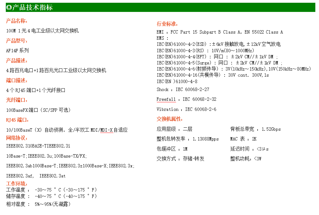4路百兆電口+1路百兆FX光口工業(yè)級以太網(wǎng)交換機(jī),支持4個10Base-T/100Base-TX電口和1個100Base-X光口。產(chǎn)品符合FCC、CE、ROHS標(biāo)準(zhǔn)。AF14F系列交換機(jī)具有-30℃~75℃的工作溫度,具有超強(qiáng)的堅(jiān)固度能適應(yīng)各種嚴(yán)苛環(huán)境,也可以非常方便的安置在空間緊湊的控制箱中。導(dǎo)軌的安裝特性、寬溫操作及擁有IP40防護(hù)等級的外殼及LED指示燈,使AF14F成為一個即插即用的工業(yè)級設(shè)備,為用戶的以太網(wǎng)設(shè)備聯(lián)網(wǎng)提供可靠、便捷的解決方案。