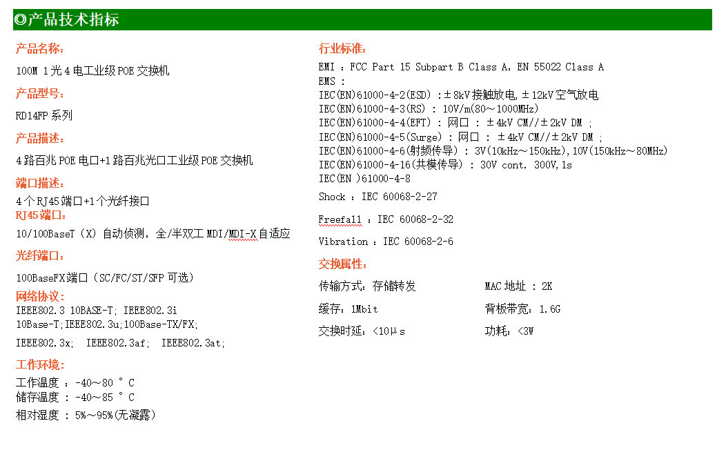 4路百兆POE電口+1路百兆SFP光口工業級以太網POE交換機,支持4個10/100Base-TX電口和1個100Base-X光口。產品符合FCC、CE、ROHS標準。RD14FP系列交換機具有-40℃~80℃的工作溫度,具有超強的堅固度能適應各種嚴苛環境,也可以非常方便的安置在空間緊湊的控制箱中。導軌的安裝特性、寬溫操作及擁有IP40防護等級的外殼及LED指示燈,使RD14FP成為一個即插即用的工業級設備,為用戶的以太網設備聯網提供可靠、便捷的解決方案。