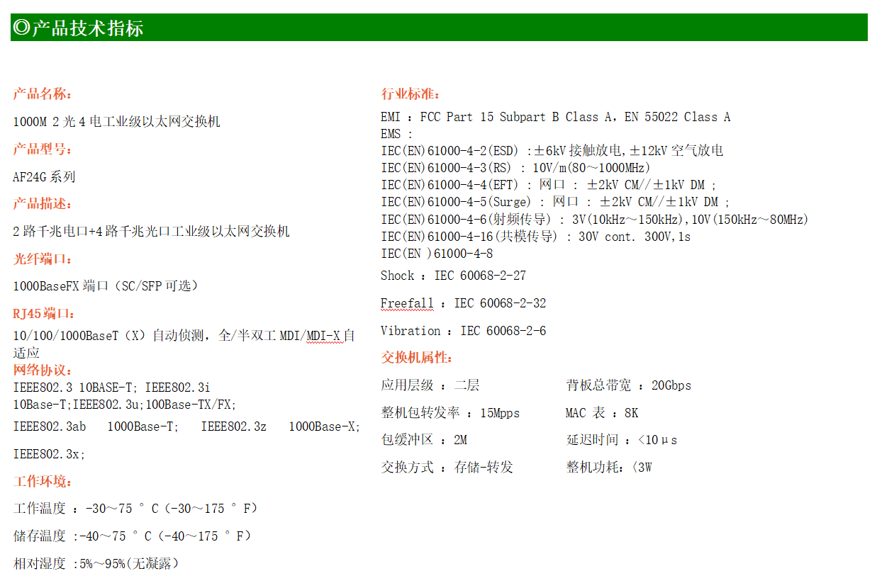 4路千兆電口+2路千兆FX光口工業級以太網交換機,支持4個100Base-T/1000Base-TX電口和2個1000Base-X光口。產品符合FCC、CE、ROHS標準。AF24G系列交換機具有-30℃~75℃的工作溫度,具有超強的堅固度能適應各種嚴苛環境,也可以非常方便的安置在空間緊湊的控制箱中。導軌的安裝特性、寬溫操作及擁有IP40防護等級的外殼及LED指示燈,使AF24G成為一個即插即用的工業級設備,為用戶的以太網設備聯網提供可靠、便捷的解決方案。