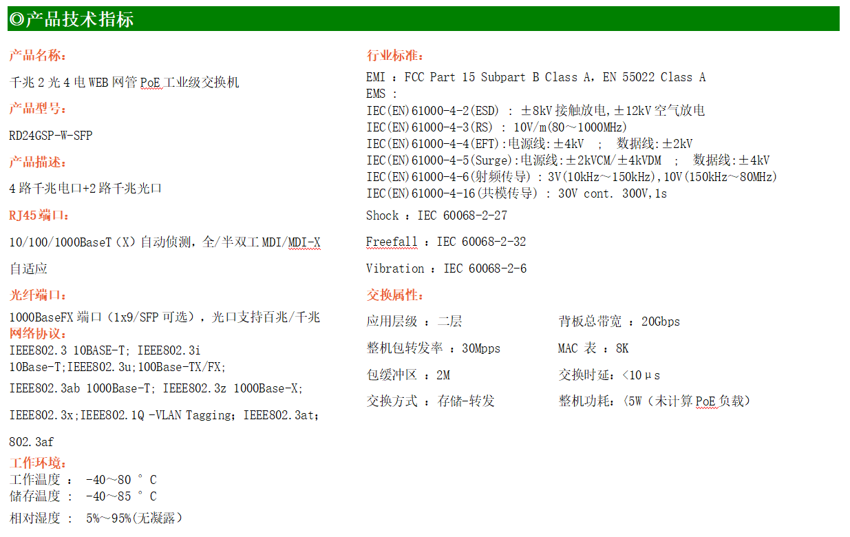 RD24GSP-W系列WEB管理工業(yè)級(jí)以太網(wǎng)PoE交換機(jī),產(chǎn)品符合FCC、CE、ROHS標(biāo)準(zhǔn),支持工業(yè)現(xiàn)場(chǎng)所需的以太網(wǎng)二層協(xié)議,保證通信網(wǎng)絡(luò)的穩(wěn)定性。該系列交換機(jī)采用低功耗、無(wú)風(fēng)扇設(shè)計(jì),確保無(wú)噪聲干擾,同時(shí)支持-40~80℃工作溫度和良好的EMC電磁兼容性能,保證在惡劣的工業(yè)環(huán)境中保持穩(wěn)定的工作,為工廠自動(dòng)化,智能交通,視頻監(jiān)控等工業(yè)應(yīng)用領(lǐng)域組建快速穩(wěn)定的網(wǎng)絡(luò)終端接入網(wǎng)絡(luò)提供安全可靠的解決方案。