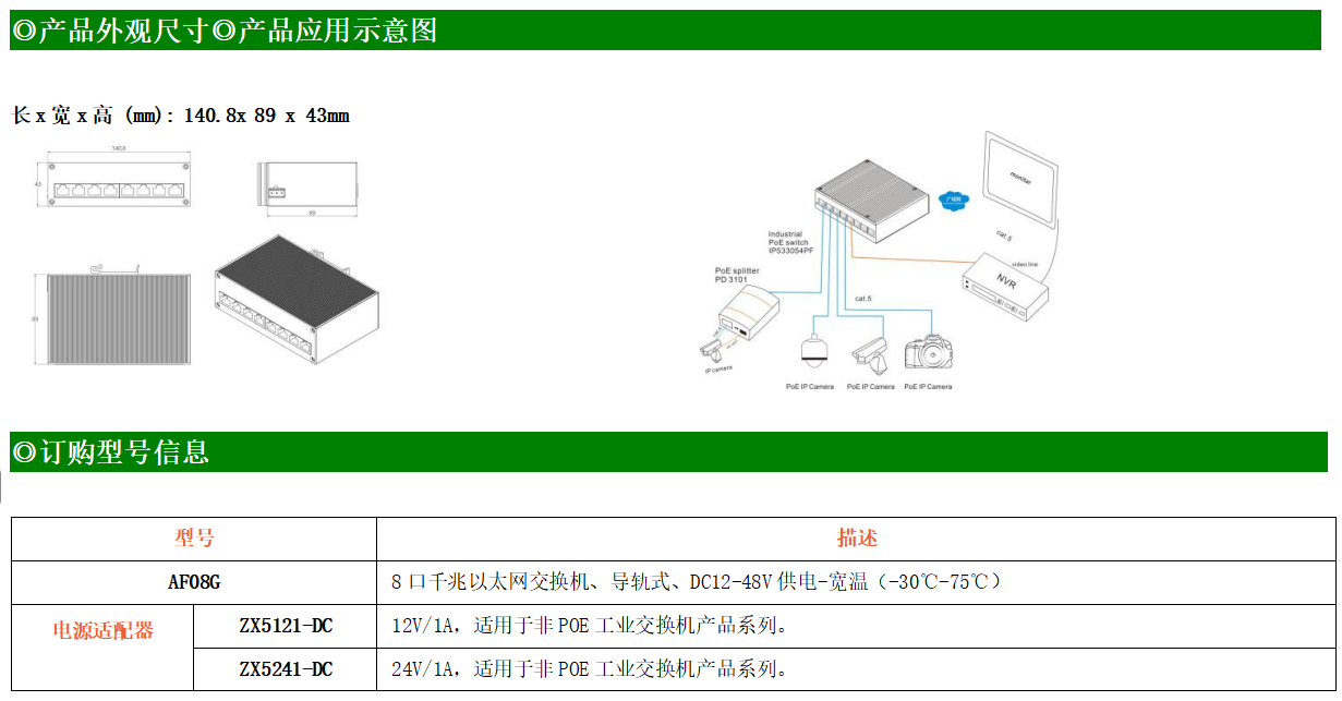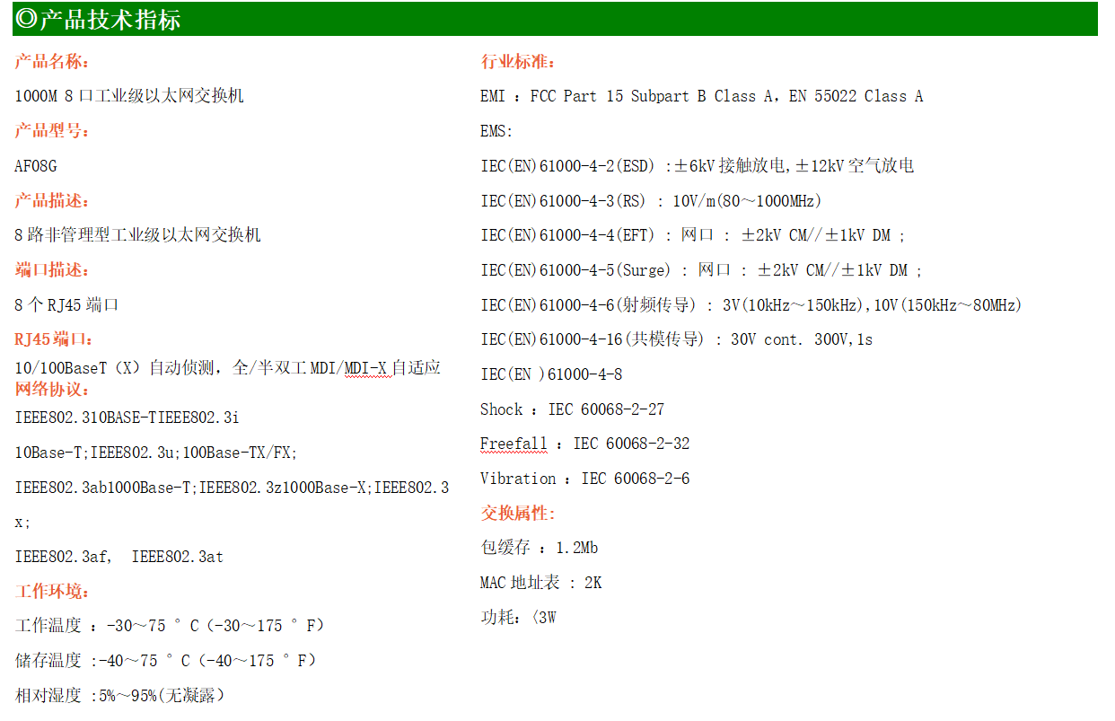 8路千兆電口工業(yè)級以太網(wǎng)交換機(jī),支持8個10Base-T/100Base-T/1000Base-TX電口。產(chǎn)品符合FCC、CE、ROHS標(biāo)準(zhǔn)。AF08G交換機(jī)具有-30℃~75℃的工作溫度,具有超強(qiáng)的堅固度能適應(yīng)各種嚴(yán)苛環(huán)境,也可以非常方便的安置在空間緊湊的控制箱中。導(dǎo)軌的安裝特性、寬溫操作及擁有IP40防護(hù)等級的外殼及LED指示燈,使AF08G成為一個即插即用的工業(yè)級設(shè)備,為用戶的以太網(wǎng)設(shè)備聯(lián)網(wǎng)提供可靠、便捷的解決方案。