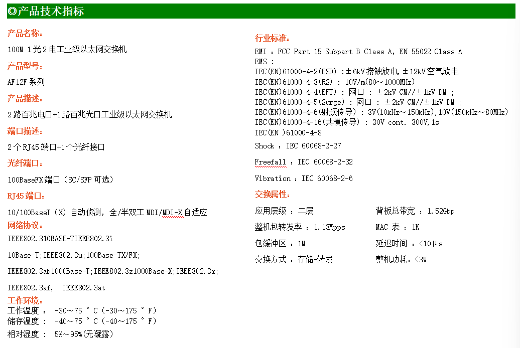2路百兆電口+1路百兆SFP光口工業(yè)級(jí)以太網(wǎng)交換機(jī),支持2個(gè)10Base-T/100Base-TX電口和1個(gè)100Base-X光口。產(chǎn)品符合FCC、CE、ROHS標(biāo)準(zhǔn)。AF12F系列交換機(jī)具有-30℃~75℃的工作溫度,具有超強(qiáng)的堅(jiān)固度能適應(yīng)各種嚴(yán)苛環(huán)境,也可以非常方便的安置在空間緊湊的控制箱中。導(dǎo)軌的安裝特性、寬溫操作及擁有IP40防護(hù)等級(jí)的外殼及LED指示燈,使AF12F成為一個(gè)即插即用的工業(yè)級(jí)設(shè)備,為用戶的以太網(wǎng)設(shè)備聯(lián)網(wǎng)提供可靠、便捷的解決方案。