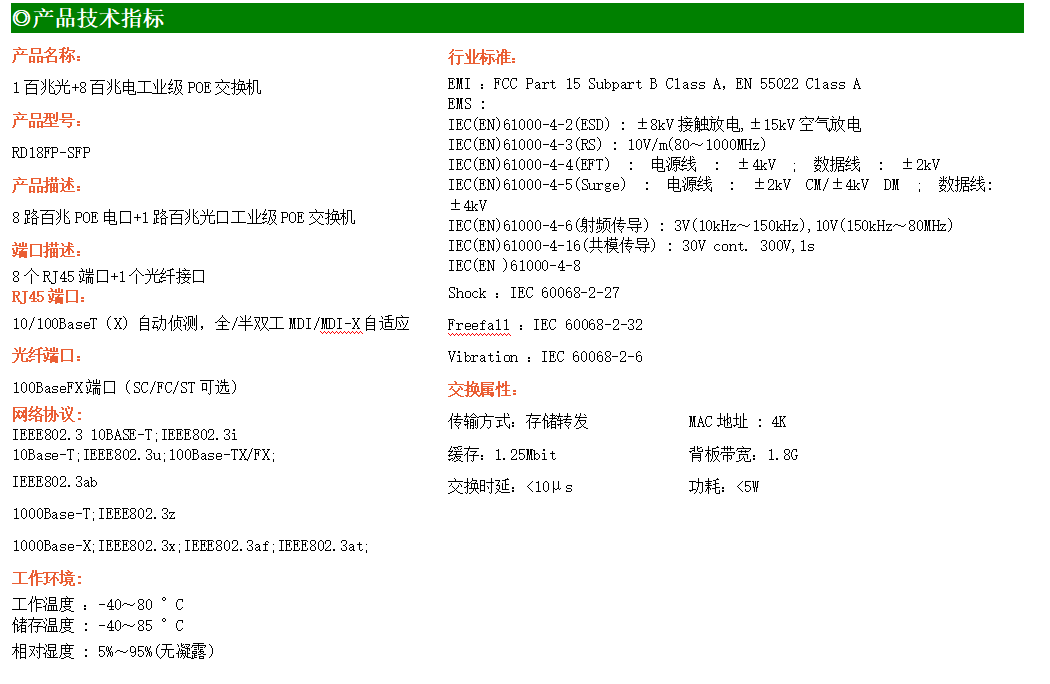 4路百兆POE電口+2路百兆FX光口工業級以太網交換機,支持4個10Base-T/100Base-TX電口和2個100Base-X光口。產品符合FCC、CE、ROHS標準。RD24FP系列交換機具有-40℃~80℃的工作溫度,具有超強的堅固度能適應各種嚴苛環境,也可以非常方便的安置在空間緊湊的控制箱中。導軌的安裝特性、寬溫操作及擁有IP40防護等級的外殼及LED指示燈,使RD24FP成為一個即插即用的工業級設備,為用戶的以太網設備聯網提供可靠、便捷的解決方案。