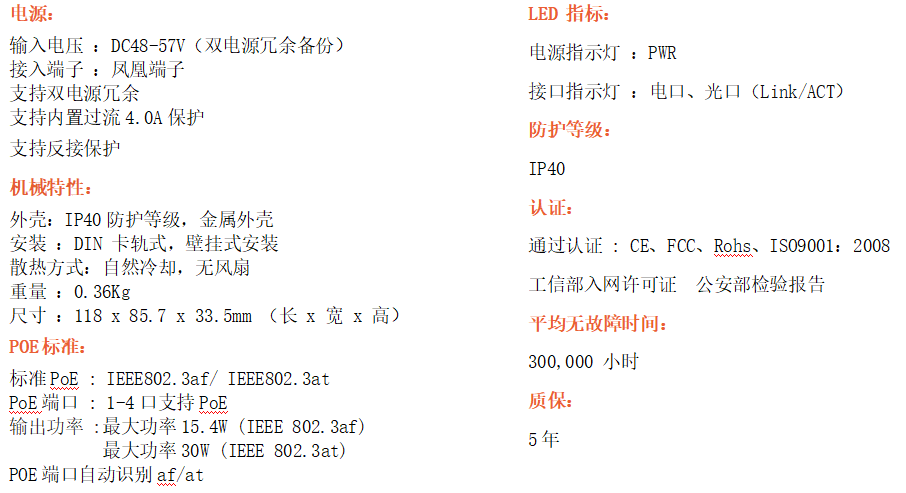 4路千兆POE電口+1路千兆FX光口工業級以太網POE交換機,支持4個10/100/1000Base-TX電口和1個1000Base-X光口。產品符合FCC、CE、ROHS標準。RD14GP系列交換機具有-40℃~80℃的工作溫度,具有超強的堅固度能適應各種嚴苛環境,也可以非常方便的安置在空間緊湊的控制箱中。導軌的安裝特性、寬溫操作及擁有IP40防護等級的外殼及LED指示燈,使RD14GP成為一個即插即用的工業級設備,為用戶的以太網設備聯網提供可靠、便捷的解決方案。