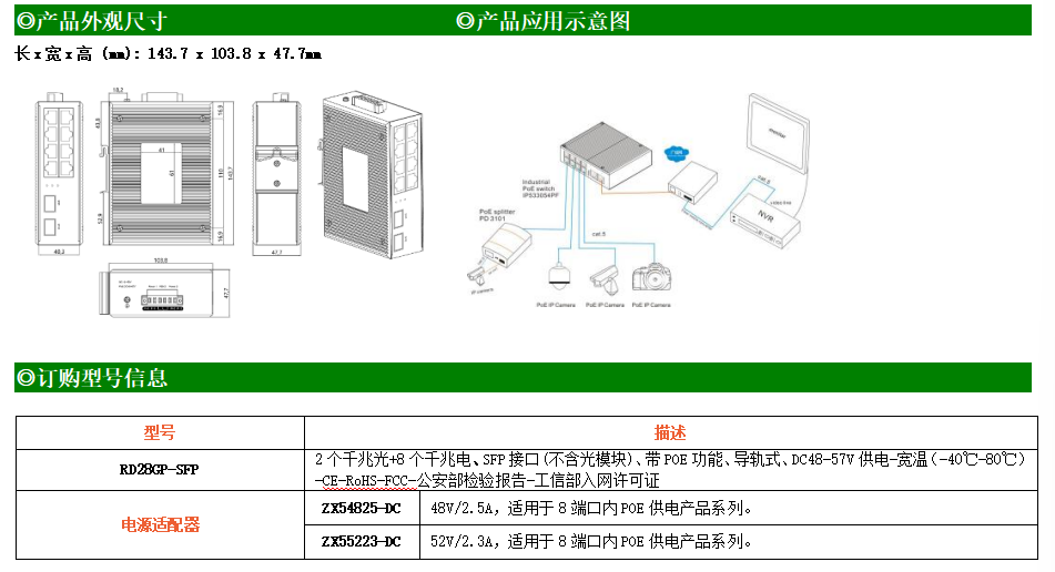 8路千兆POE電口+2路千兆FX光口工業級以太網POE交換機,支持8個10/100/1000Base-TX電口和2個1000Base-X光口。產品符合FCC、CE、ROHS標準。RD28GP-SFP交換機具有-40℃~80℃的工作溫度,具有超強的堅固度能適應各種嚴苛環境,也可以非常方便的安置在空間緊湊的控制箱中。導軌的安裝特性、寬溫操作及擁有IP40防護等級的外殼及LED指示燈,使RD28GP-SFP成為一個即插即用的工業級設備,為用戶的以太網設備聯網提供可靠、便捷的解決方案。