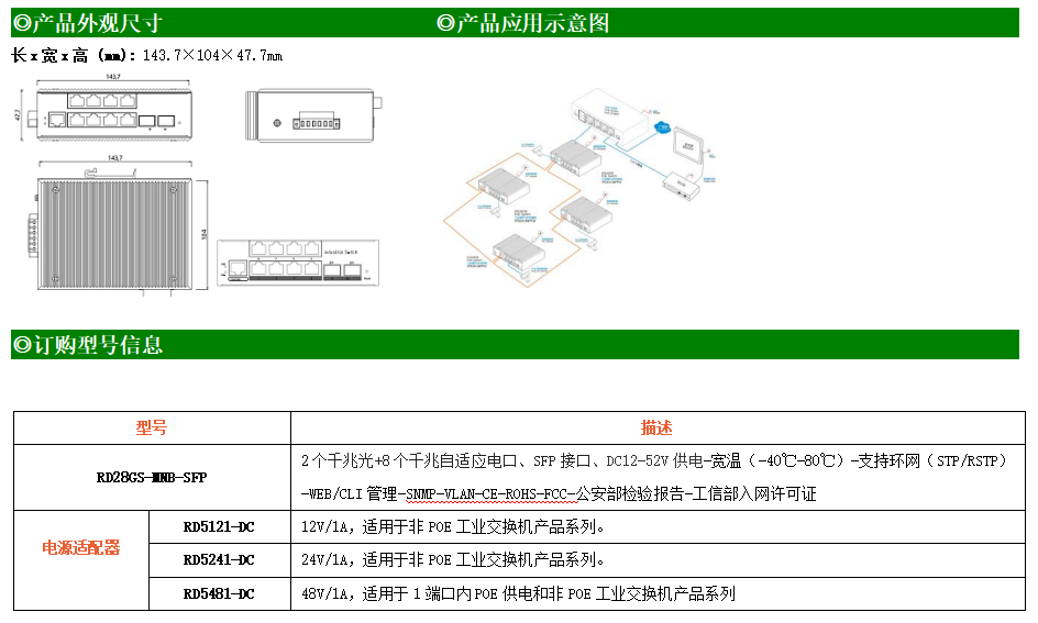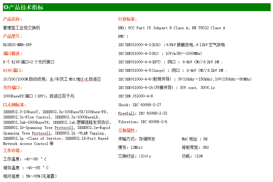 RD28GS-MNB是網(wǎng)管型工業(yè)以太網(wǎng)交換機(jī),產(chǎn)品符合FCC、CE、RoHS標(biāo)準(zhǔn)。支持2個(gè)千兆光口和8個(gè)千兆電口;支持工業(yè)現(xiàn)場(chǎng)所需的以太網(wǎng)二層協(xié)議,保證通信網(wǎng)絡(luò)的穩(wěn)定性;該系列交換機(jī)采用低功耗、無(wú)風(fēng)扇設(shè)計(jì),確保無(wú)噪聲干擾,同時(shí)支持-40~85℃工作溫度和良好的EMC電磁兼容性能,保證在惡劣的工業(yè)環(huán)境中保持穩(wěn)定的工作,為工廠自動(dòng)化,智能交通,視頻監(jiān)控等工業(yè)應(yīng)用領(lǐng)域組建快速穩(wěn)定的網(wǎng)絡(luò)終端接入網(wǎng)絡(luò)提供安全可靠的解決方案。