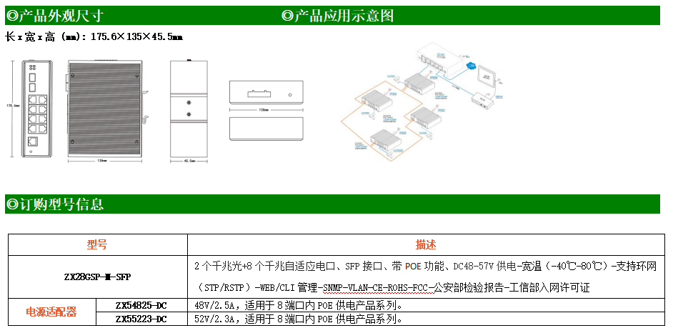 ZX28GSP-M是網管型工業以太網POE交換機,產品符合FCC、CE、RoHS標準。支持2個千兆光口和8個千兆電口;支持工業現場所需的以太網二層協議,保證通信網絡的穩定性;該系列交換機采用低功耗、無風扇設計,確保無噪聲干擾,同時支持-40~80℃工作溫度和良好的EMC電磁兼容性能,保證在惡劣的工業環境中保持穩定的工作,為工廠自動化,智能交通,視頻監控等工業應用領域組建快速穩定的網絡終端接入網絡提供安全可靠的解決方案。