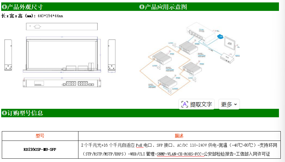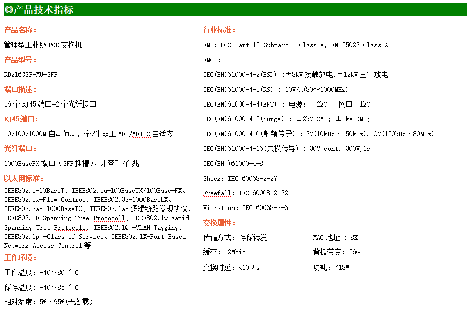 RD216GSP-MU-SFP是網管型工業以太網POE交換機,產品符合FCC、CE、RoHS標準。支持2個千兆光口和16個千兆POE電口,所有PoE端口符合IEEE802.3af/at標準。支持工業現場所需的以太網二層協議,保證通信網絡的穩定性;該系列交換機采用低功耗、無風扇設計,確保無噪聲干擾,同時支持-40~80℃工作溫度和良好的EMC電磁兼容性能,保證在惡劣的工業環境中保持穩定的工作,為工廠自動化,智能交通,視頻監控等工業應用領域組建快速穩定的網絡終端接入網絡提供安全可靠的解決方案。