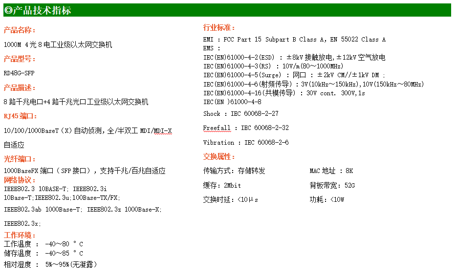 8路千兆電口+4路千兆FX光口工業(yè)級(jí)以太網(wǎng)交換機(jī),支持8個(gè)100Base-T/1000Base-TX電口和4個(gè)1000Base-X光口。產(chǎn)品符合FCC、CE、ROHS標(biāo)準(zhǔn)。RD48G交換機(jī)具有-40℃~80℃的工作溫度,具有超強(qiáng)的堅(jiān)固度能適應(yīng)各種嚴(yán)苛環(huán)境,也可以非常方便的安置在空間緊湊的控制箱中。導(dǎo)軌的安裝特性、寬溫操作及擁有IP40防護(hù)等級(jí)的外殼及LED指示燈,使RD48G成為一個(gè)即插即用的工業(yè)級(jí)設(shè)備,為用戶的以太網(wǎng)設(shè)備聯(lián)網(wǎng)提供可靠、便捷的解決方案。