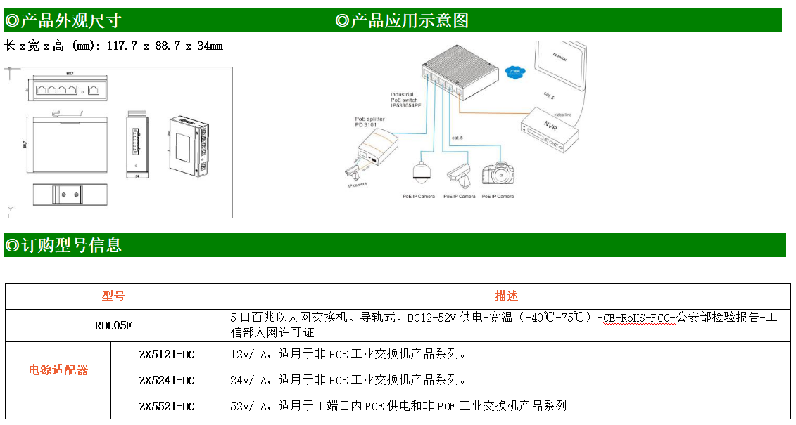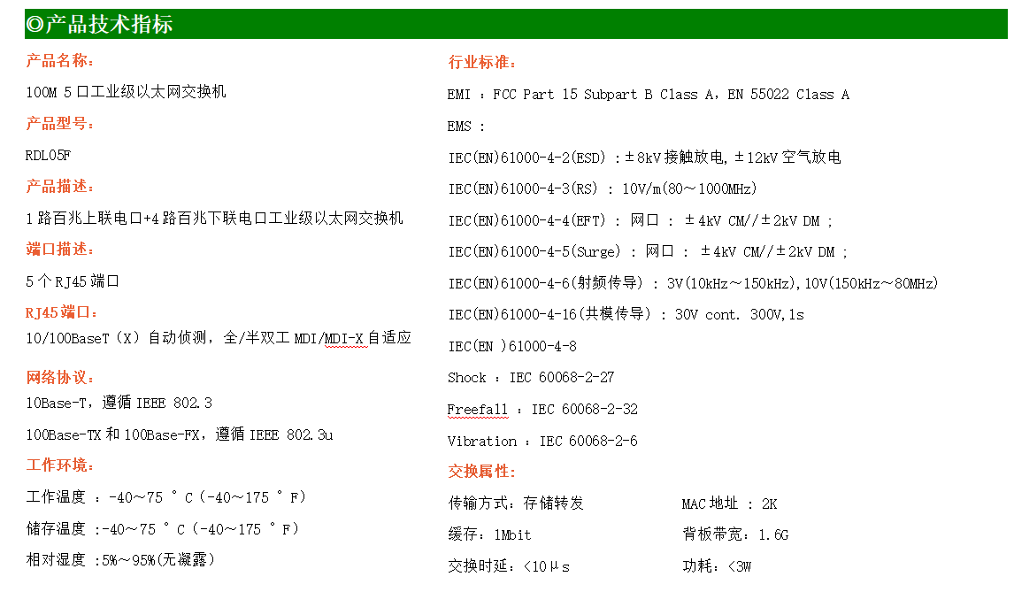 1路百兆上聯(lián)電口+4路百兆下聯(lián)電口工業(yè)級以太網(wǎng)交換機,支持1個10/100Base-TX上聯(lián)電口和4個10Base-T/100Base-TX下聯(lián)電口。產(chǎn)品符合FCC、CE、ROHS標準。RDL05F交換機具有-40℃~75℃的工作溫度,具有超強的堅固度能適應各種嚴苛環(huán)境,也可以非常方便的安置在空間緊湊的控制箱中。導軌的安裝特性、寬溫操作及擁有IP40防護等級的外殼及LED指示燈,使RDL05F成為一個即插即用的工業(yè)級設(shè)備,為用戶的以太網(wǎng)設(shè)備聯(lián)網(wǎng)提供可靠、便捷的解決方案。