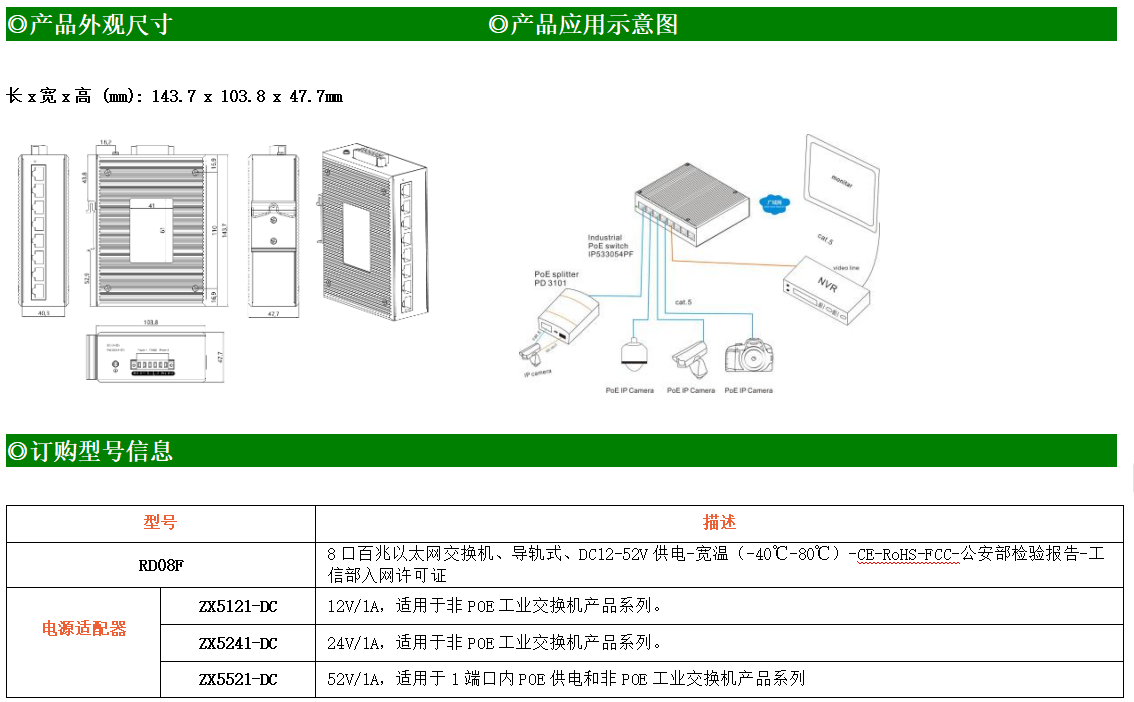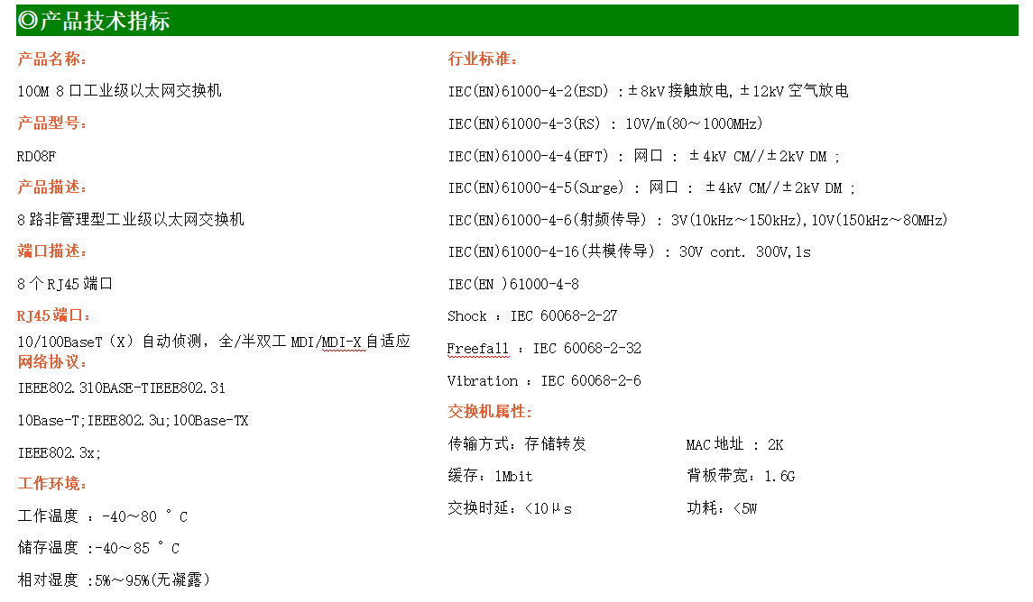 8路百兆電口工業級以太網交換機,支持8個10Base-T/100Base-TX電口。產品符合FCC、CE、ROHS標準。RD08F交換機具有-40℃~80℃的工作溫度,具有超強的堅固度能適應各種嚴苛環境,也可以非常方便的安置在空間緊湊的控制箱中。導軌的安裝特性、寬溫操作及擁有IP40防護等級的外殼及LED指示燈,使RD08F成為一個即插即用的工業級設備,為用戶的以太網設備聯網提供可靠、便捷的解決方案。