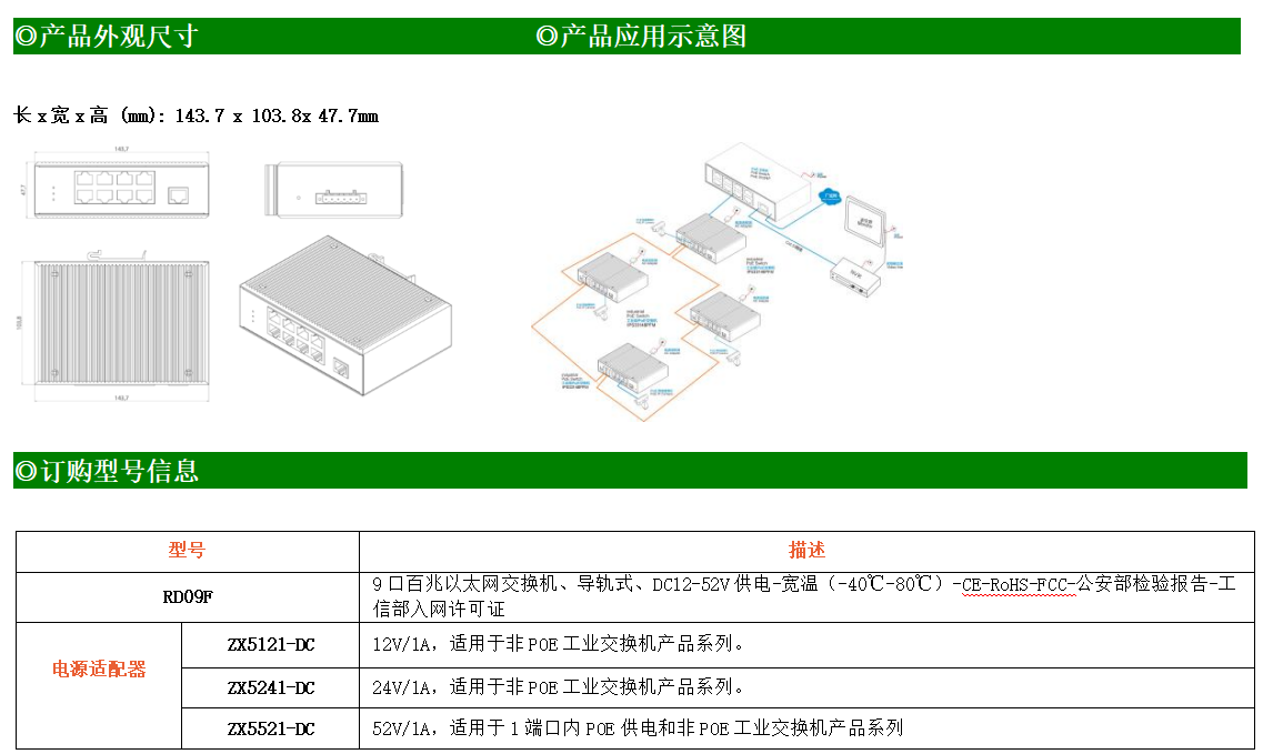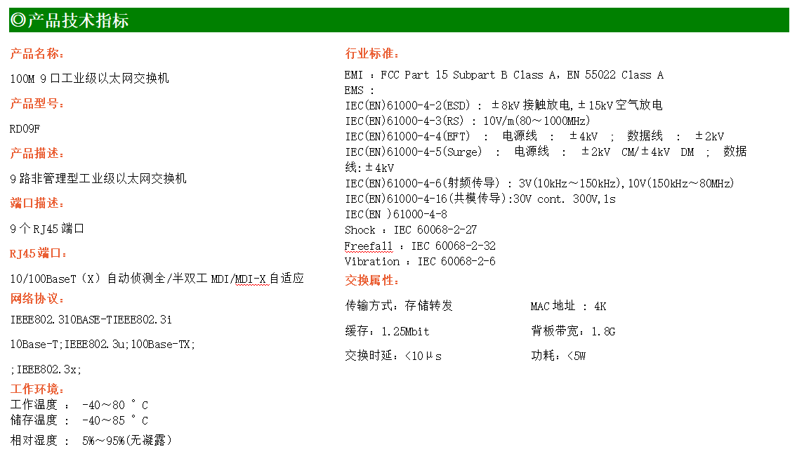 9路百兆電口工業(yè)級以太網(wǎng)交換機,支持9個10Base-T/100Base-TX電口。產(chǎn)品符合FCC、CE、ROHS標準。RD09F交換機具有-40℃~80℃的工作溫度,具有超強的堅固度能適應(yīng)各種嚴苛環(huán)境,也可以非常方便的安置在空間緊湊的控制箱中。導軌的安裝特性、寬溫操作及擁有IP40防護等級的外殼及LED指示燈,使RD09F成為一個即插即用的工業(yè)級設(shè)備,為用戶的以太網(wǎng)設(shè)備聯(lián)網(wǎng)提供可靠、便捷的解決方案。