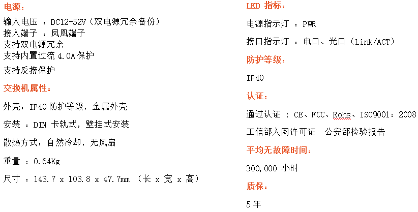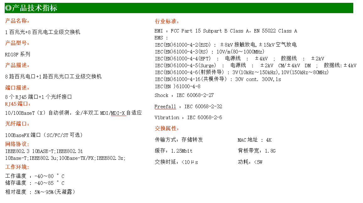 8路百兆電口+1路百兆FX光口工業級以太網交換機,支持8個10/100Base-TX電口和1個100Base-X光口。產品符合FCC、CE、ROHS標準。RD18F交換機具有-40℃~80℃的工作溫度,具有超強的堅固度能適應各種嚴苛環境,也可以非常方便的安置在空間緊湊的控制箱中。導軌的安裝特性、寬溫操作及擁有IP40防護等級的外殼及LED指示燈,使RD18F成為一個即插即用的工業級設備,為用戶的以太網設備聯網提供可靠、便捷的解決方案。