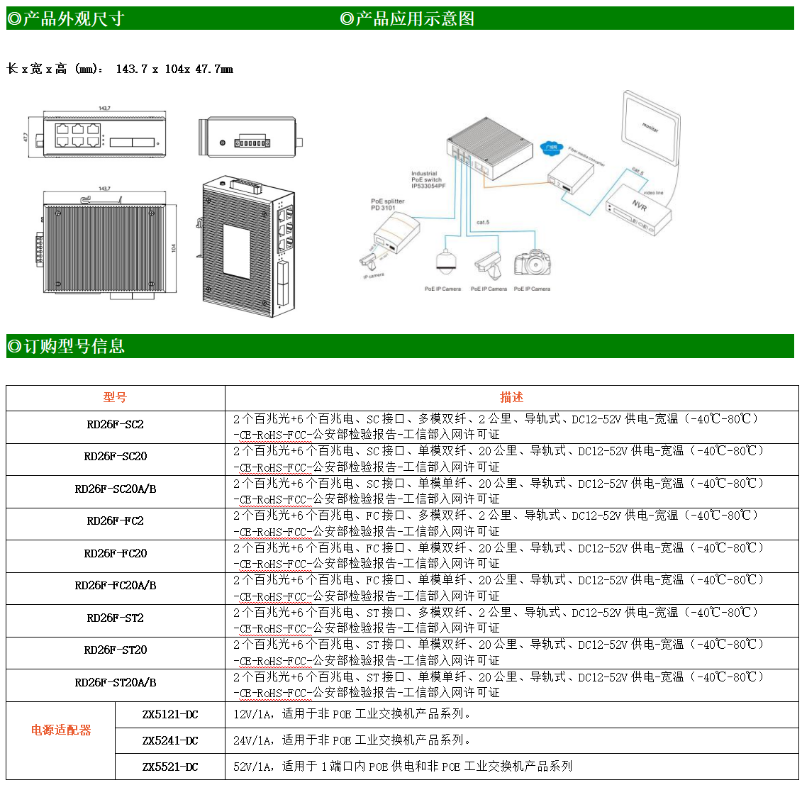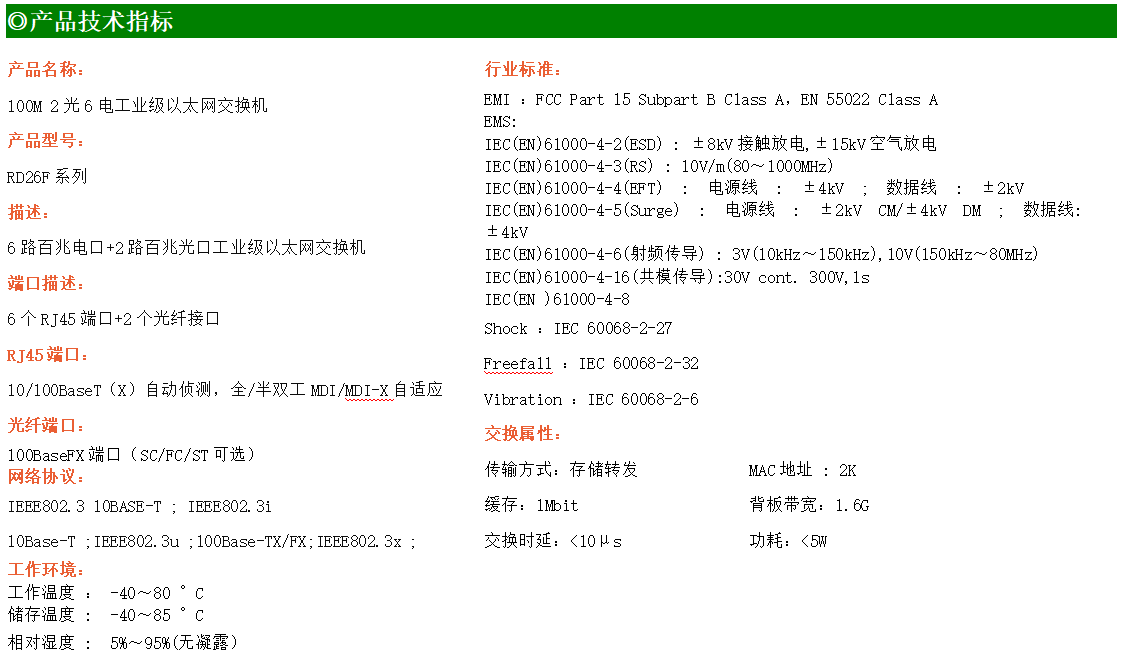 6路百兆電口+2路百兆FX光口工業(yè)級以太網(wǎng)交換機,支持6個10Base-T/100Base-TX電口和2個100Base-X光口。產(chǎn)品符合FCC、CE、ROHS標準。RD26F系列交換機具有-40℃~80℃的工作溫度,具有超強的堅固度能適應各種嚴苛環(huán)境,也可以非常方便的安置在空間緊湊的控制箱中。導軌的安裝特性、寬溫操作及擁有IP40防護等級的外殼及LED指示燈,使RD26F成為一個即插即用的工業(yè)級設備,為用戶的以太網(wǎng)設備聯(lián)網(wǎng)提供可靠、便捷的解決方案。