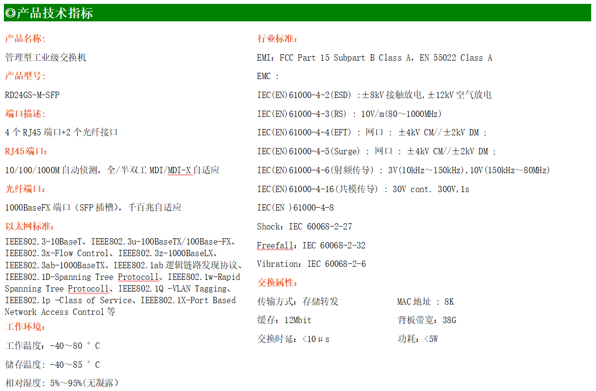 RD24GS-M是網管型工業以太網交換機,產品符合FCC、CE、RoHS標準。支持2個千兆光口和4個千兆電口;支持工業現場所需的以太網二層協議,保證通信網絡的穩定性;該系列交換機采用低功耗、無風扇設計,確保無噪聲干擾,同時支持-40~80℃工作溫度和良好的EMC電磁兼容性能,保證在惡劣的工業環境中保持穩定的工作,為工廠自動化,智能交通,視頻監控等工業應用領域組建快速穩定的網絡終端接入網絡提供安全可靠的解決方案。