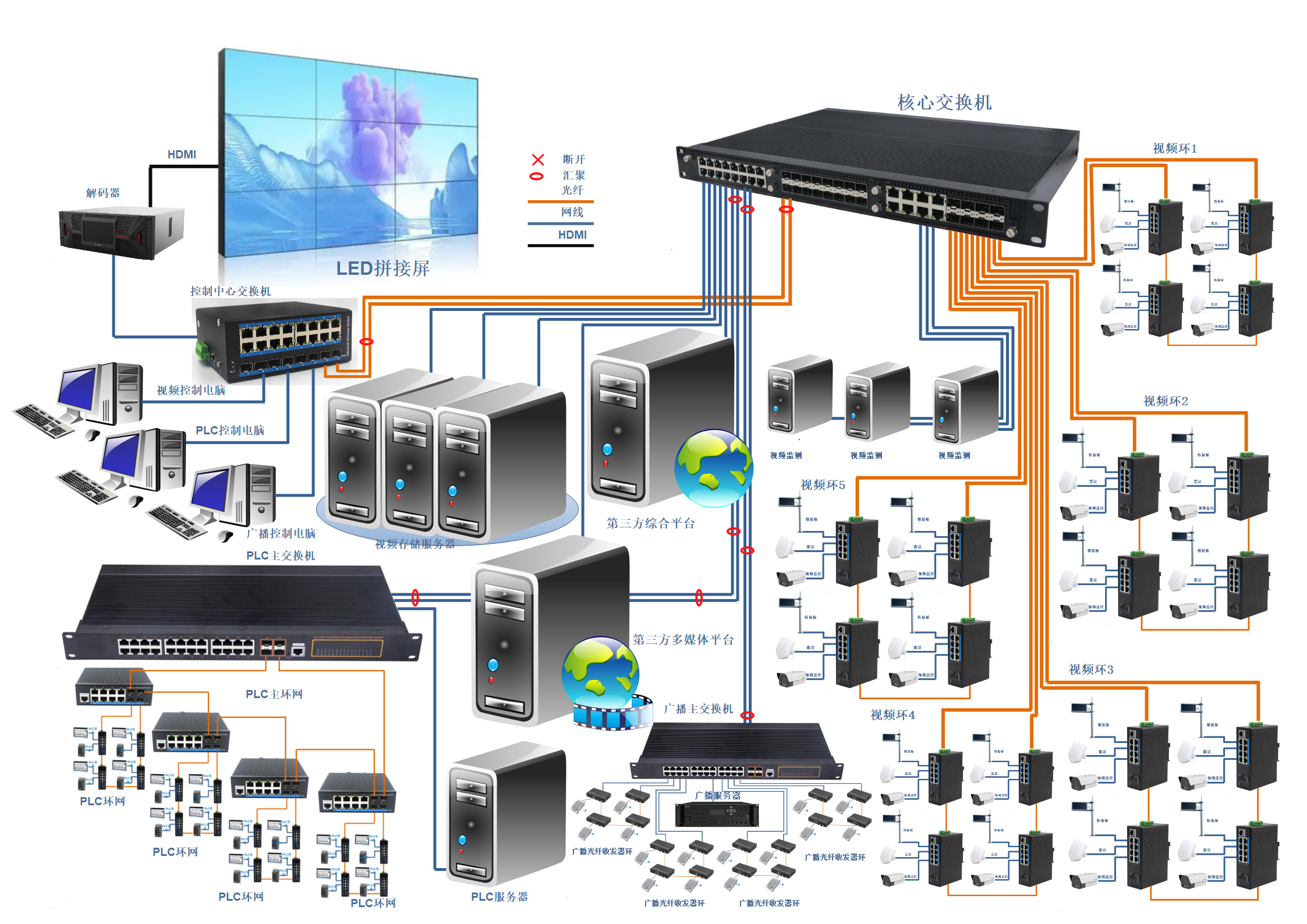 某地治理中心需要在隧道環(huán)境下建設(shè)綜合網(wǎng)絡(luò)監(jiān)控通信系統(tǒng)。該項(xiàng)目涉及視頻監(jiān)控系統(tǒng)接入、PLC工業(yè)控制系統(tǒng)接入、廣播應(yīng)急通信系統(tǒng)接入等多種關(guān)鍵業(yè)務(wù)的網(wǎng)絡(luò)支撐,同時(shí)還需支持第三方綜合平臺(tái)和多媒體平臺(tái)的統(tǒng)一接入管理。